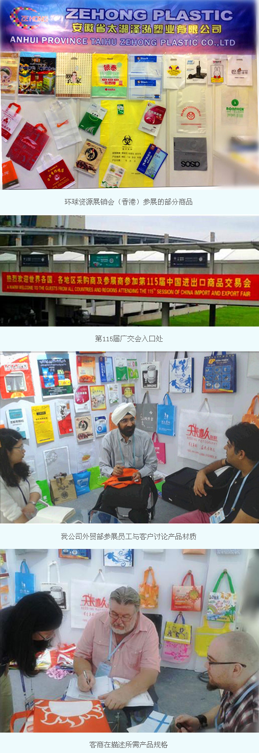 本次参展的四指袋、无纺布袋、食品包装复合袋、手提袋、购物袋等产品得到国内外买家的青睐。在询价、报价过程中,印度POPSON’S国际公司、日本福禄哈世公司、墨西哥APEE股份公司等客户对无纺布袋、LDPE背心袋系列产品表现出浓厚兴趣,并要求我公司尽快交付样品。意向性订单金额大约300万美元。其中,日本福禄哈世公司的业务代表有意向订购8000箱环保购物袋。回到公司后,外贸部即刻与对方取得联系并积极跟进。张总在公司管理层工作会上深入分析公司内外部形势,决定公司经营要继续把优质保量作为生产重点,同时营销工作要在发展国内市场的基础上,进一步拓展国际市场。借助太湖县良好的经济政策平台,把企业做大做强。